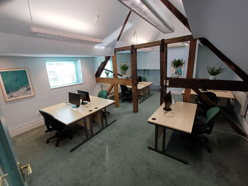 Room 9 on the 2nd floor is full of character, having a large oak frame dividing it into two separate but connected areas. It’s perfect for three clusters of 2 desks, plus a 7th desk fits comfortably on the right as you go into the room.